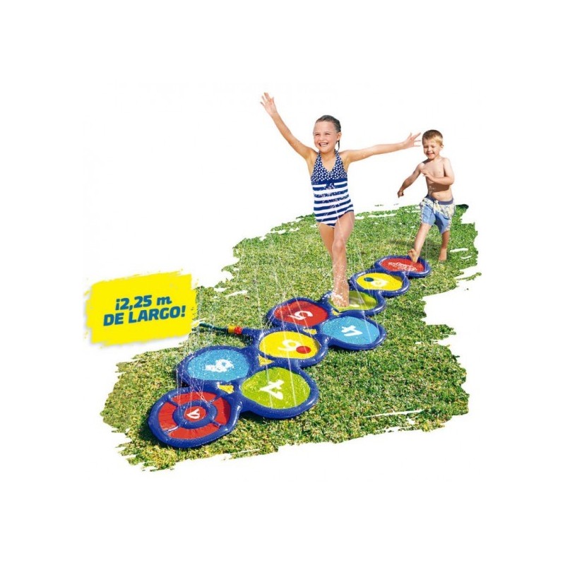 El juego de la rayuela de toda la vida ¡ahora super refrescante! Tira la ficha a uno de los círculos y ahora salta sin caerte hasta llegar al círculo y recuperarla. ¡Mira como sale el agua mientras saltas! Con adaptador para enganchar a la manguera. Muy fácil montaje Lanza agua ininterrumpidamente Para jugar sólo o con amigos Colores brillantes Dimensiones producto: 2,3m de largo. Edad recomendada: +6 años.
