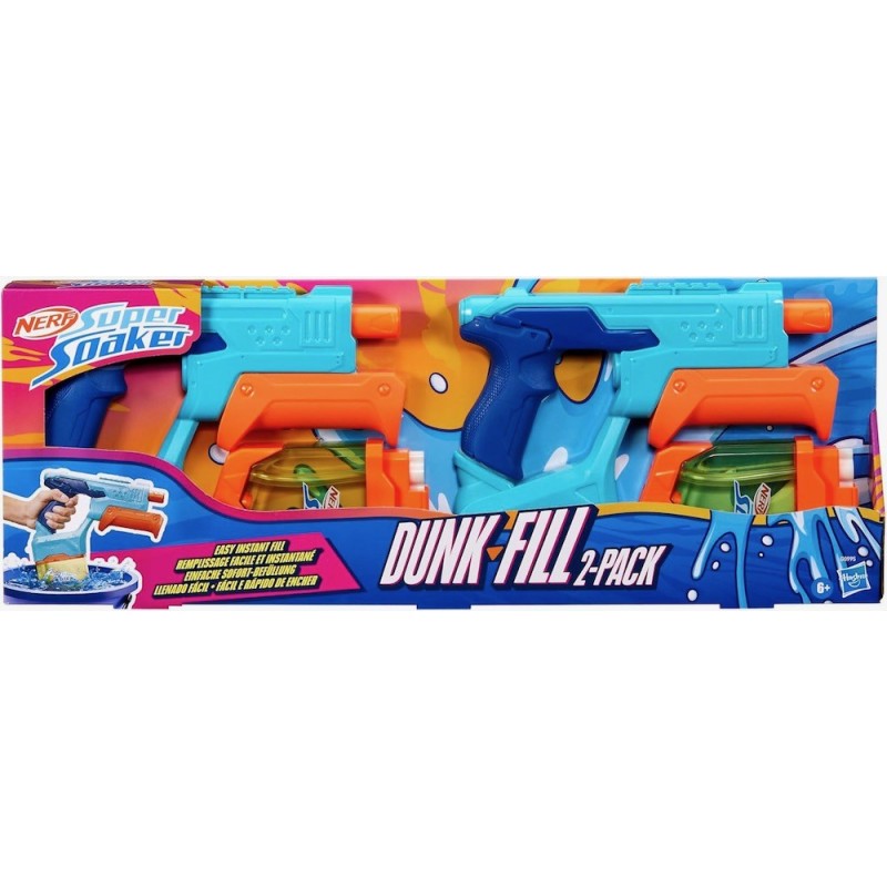 Edad recomendada: +6 años. NERF SUPER SOAKER - DUNK-FILL - PACK DOBLE: Los tanques se llenan en un instante, ¡simplemente sumerge y listo! Lánzate a la acción acuática en un instante con estos 2 lanzadores de agua Dunk-Fill TANQUES DE AGUA CON DISEÑO FÁCIL DE LLENAR: ¡Súper rápido! ¡Súper fácil! Sumerge los tanques en agua para llenarlos en un instante TANQUES TRASLÚCIDOS: Los tanques traslúcidos te permiten ver el interior. ¡Mira lo rápido que se llenan los tanques! TANQUE DE 325 mL: El tanque tiene una capacidad de 325 mL para que te diviertas en tus juegos acuáticos al aire libre. BOMBEA Y LANZA: Bombea el deslizador hacia delante y hacia atrás para lanzar un chorro de agua.