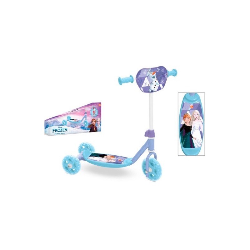 Primer patinete Frozen con 3 ruedas. El reposapiés es antideslizante, los mangos rígidos y las ruedas de 120 mm de diámetro hechas de poliuretano con rodamientos de precisión. El manillar se puede ajustar en altura de 58 a 65 cm. Incluye bolsa para llevar tus cosas contigo allá donde vayas. Soporta hasta 20 Kg. Dimensiones: 60 x 57.5 x 26 cm. Edad recomendada: +24 meses.