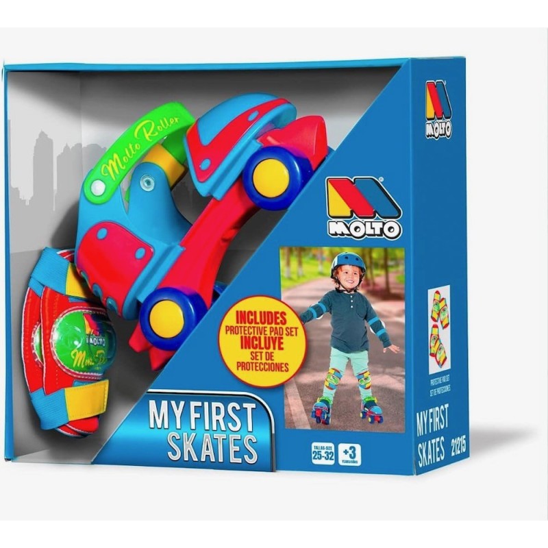 Descubre nuestros patines de 4 ruedas para niños y niñas de iniciación. Aprende a patinar con Molto. Ajustables de la talla 25-32 con freno delantero y correa de cierre de seguridad. Incluye Coderas y rodilleras incluidas en los modelos de 4 ruedas "My first Skates". Nuestro patín convertible está recomendado para niños y niñas a partir de 3 años. Se pueden ajustar desde la talla 25 a la 32.