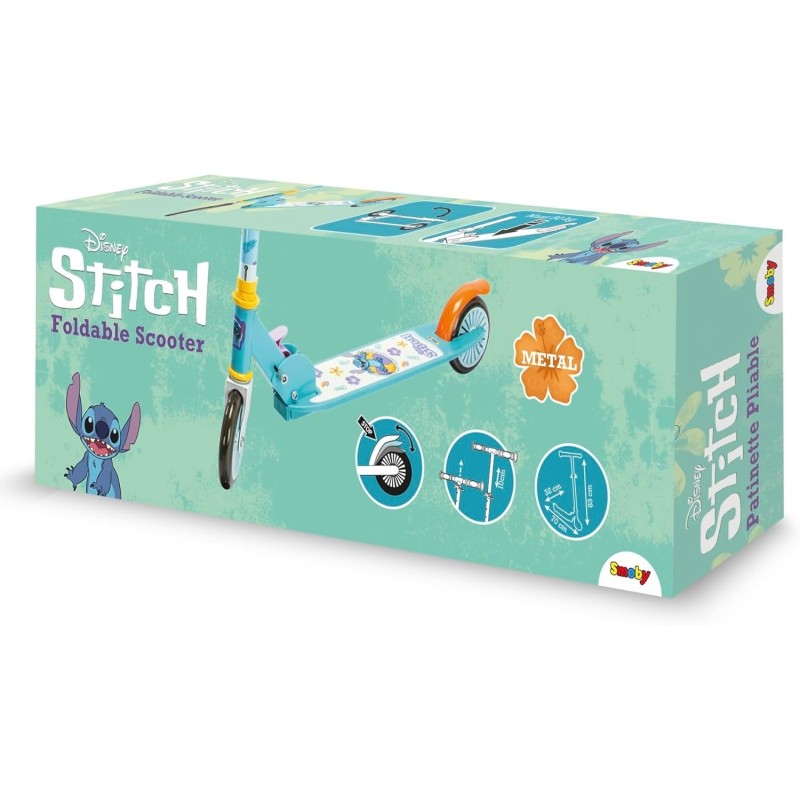 Guiñón ajustable en 3 posiciones (73/78/83 cm). Patinete 2 ruedas plegable con diseño Stitch, óptimo para niños a partir de 5 años; su atractivo diseño del famoso personaje de Disney, Stitch, hará que tus pequeños disfruten aún más de su paseo. Estructura metálica robusta y plegable, diseñada para soportar un peso máximo de 50 kg; pensada para resistir el uso diario y con la facilidad de plegarse para un almacenamiento compacto y transporte sencillo. Reposa-pies antideslizante y freno trasero al pie, para una óptima seguridad durante el uso; el freno trasero asegura una parada rápida y controlada, mientras que el reposapiés antideslizante evita resbalones.