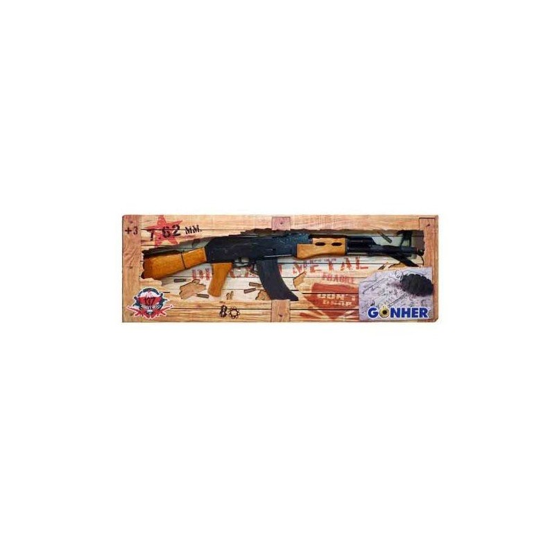 Rifle de asalto metálico con 8 disparos. Dimensiones: 72,5 x 23 cm. Fabricado en España por Gonher. Edad recomendada: a partir de 8 años.