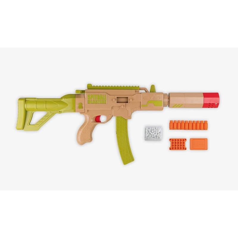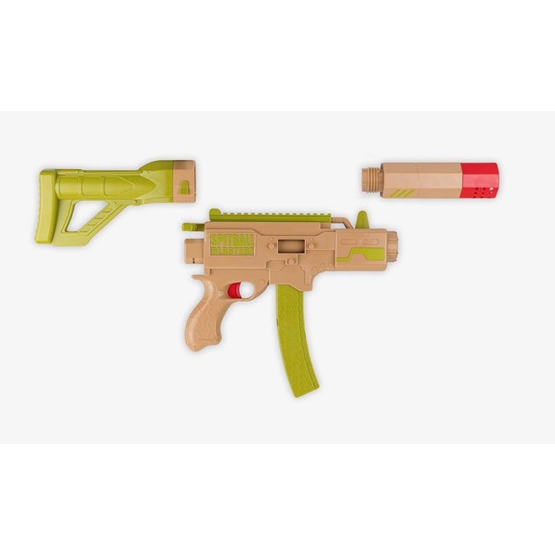 Metralleta lanza papel. Lanza bolas de papel mojado a más de 10 metros, 8 disparos sin recargar. 1. Moja papel e introdúcelo en el molde. 2. Presiona el molde 3. Introduce el papel en la vaina 4. Pon las vainas en el cargador, y a jugar. En cada recarga la vaina anterior salta imitando un efecto real. Edad recomendada: a partir de 8 años. Fabricada en España.