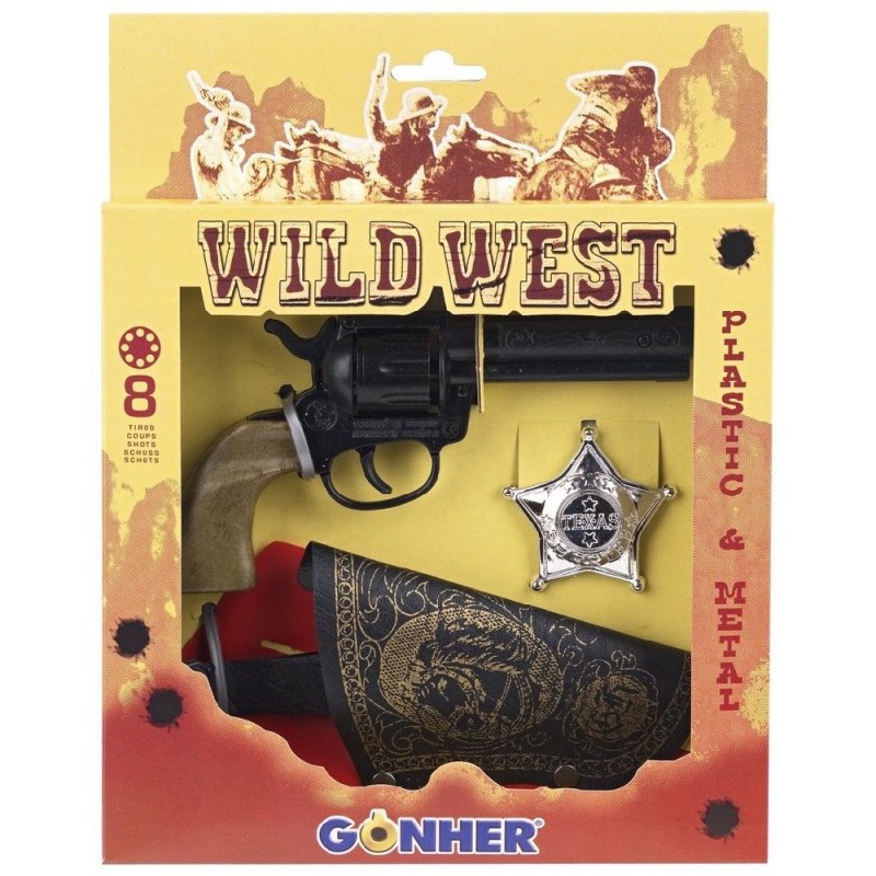 Revólver de plástico con complementos del lejano oeste. Incluye fulminante de 8 tiros. Viene con cartuchera y placa de sheriff. Edad recomendada: a partir de 3 años. Fabricada en España.