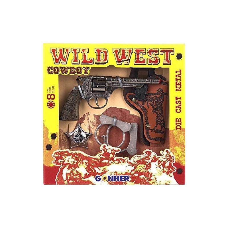 Revólver de metal con detalles en plástico. Con complementos del lejano oeste. Incluye fulminante de 8 tiros. Viene con cartuchera, placa de sheriff y esposas. Edad recomendada: a partir de 3 años. Fabricado en España.