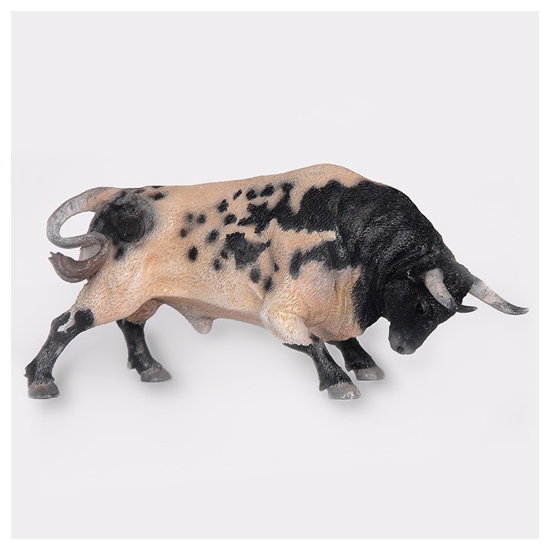 Toro bravo Berrendo embistiendo, réplica animal a escala pintada a mano con el máximo de detalles, esta figura forma parte de una colección de toros con diferentes pelajes y posiciones (trotando o embistiendo).