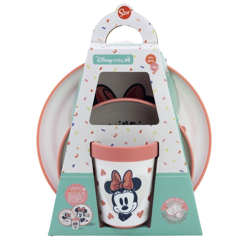 Edad recomendada: +10 meses. Vajilla para bebé antideslizante compuesto por taza de aprendizaje, cuenco y cuchara de Minnie Mouse - Disney Baby Juego de vajilla infantil con base antideslizante que se sujeta a cualquier superficie lisa. Incluye un plato, un cuenco y un vaso de 260 ml. Es apto para microondas y es de plástico libre de BPA. A los niñas y niñas les encantará ya que está decorado con sus personajes favoritos. - Libre de BPA - Incluye 3 piezas: plato, cuenco y vaso de 260 ml - Base antideslizante - Apto para microondas