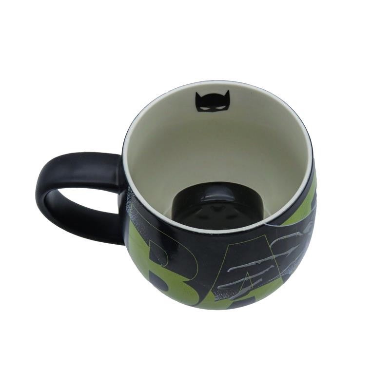 Esta taza de cerámica tiene una sorpresa caprichosa, cuando llegas al fondo de tu bebida te encontrarás con el escudo de Batman en 3D CARACTERÍSTICAS: ¡Esta original taza de cerámica con su interior en color blanco es ideal para café, té y otras bebidas frías!. Resistente a la temperatura por lo que es apta para microondas y también la puedes lavar en el lavavajillas. Capacidad: 320 ml. Sus medida son:12,5 x 8,3 x 9,5 cm REGALO ORIGINAL: Es el regalo perfecto para comenzar el día con energía.