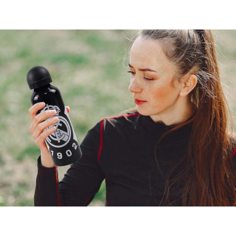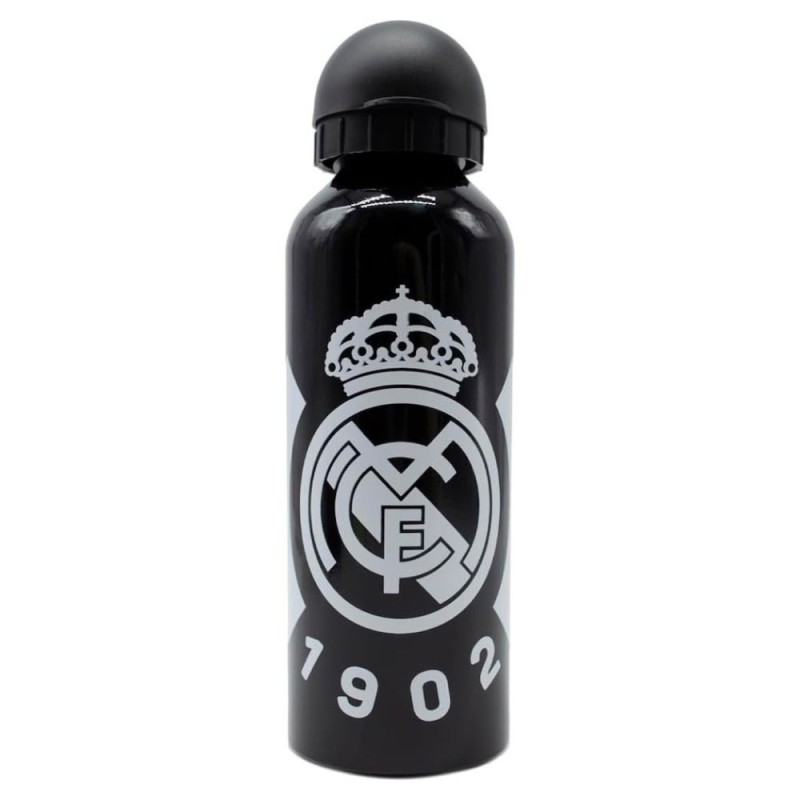 Botella Negra de agua de tu equipo de fútbol favorito para que lo tengas siempre presente en tu día a día. De aluminio, con una capacidad de 500 ml para que te mantengas siempre bien hidratado en casa o en el trabajo. Producto Oficial y Original del Real Madrid.