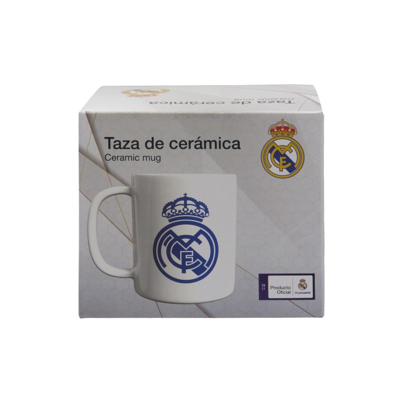 Taza diseñada para que cualquier madridista pueda disfrutar de su desayuno con los colores de su equipo. CARACTERÍSTICAS: Diseñada con el escudo del Real Madrid en color azul. Capacidad 330 ml. Apta para microondas y lavavajillas. Presentada en caja individual.