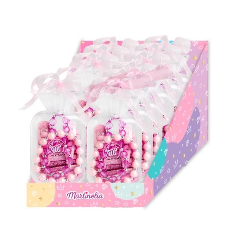 Medidas Producto: 12x6x3 Este estuche en forma de caramelo contiene una variedad de gomas y accesorios para el cabello en distintos tonos de rosa. Con esta variedad de hebillas y gomitas podrás crear todos tus peinados favoritos y variar los accesorios cuantas veces quieras.