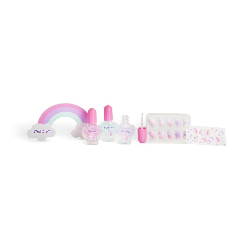 Medidas Producto: 20,5x 13,5x 2,5 cm. 3 Nail polishes 1 nail file 10 false nails Prepara la sesión de manicura más mágica y divertida con tus amig@s. Con este set tendrás todos los imprescindibles para crear los diseños más fantásticos, incluye 3 esmaltes de uñas de los colores más bonitos y con purpurina, 1 pack de uñas falsas con los dibujos más bonitos y una lima de uñas, ¡con forma de arcoíris!