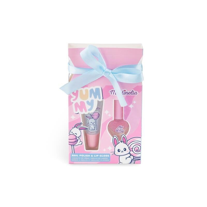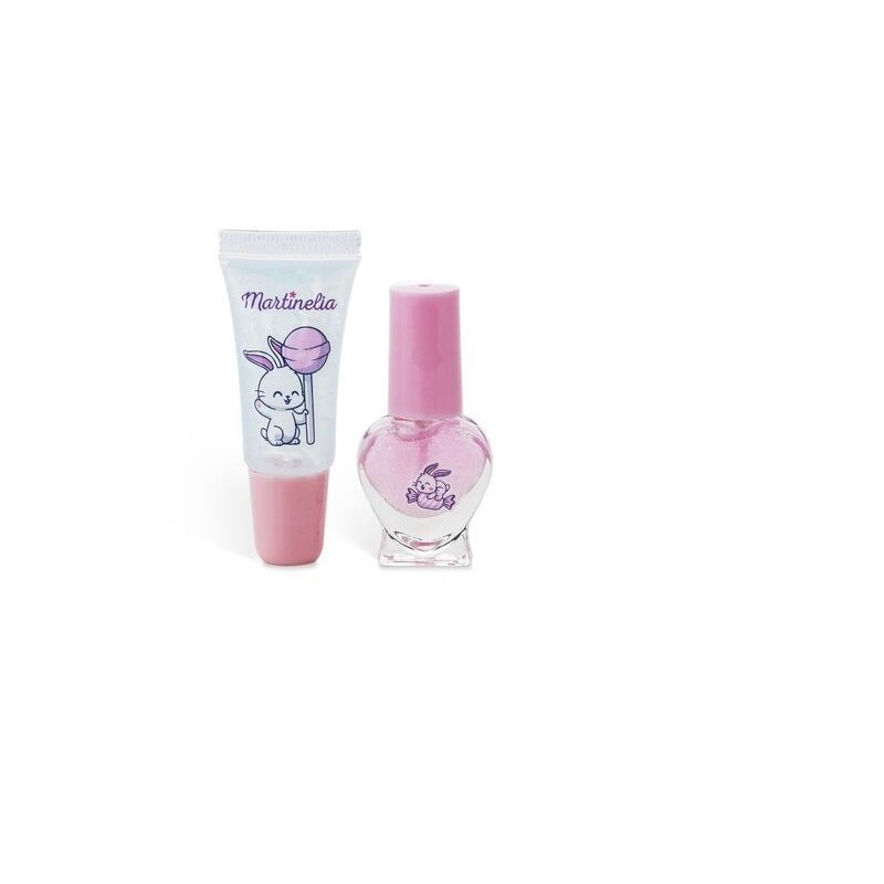 1 brillo de labios 1 esmalte de uñas Si tu hij@ es fan de los conejitos este dúo formado por un brillo labial con sabor a fresa y un esmalte de uñas rosa le encantará. ¡Totalmente adorable!