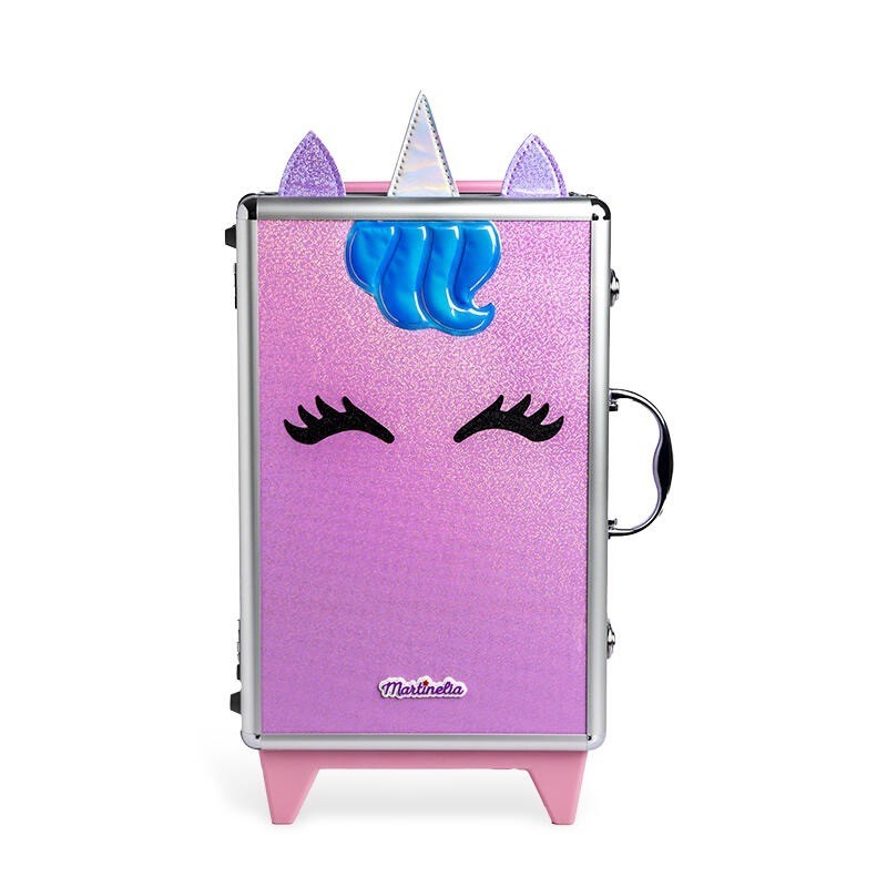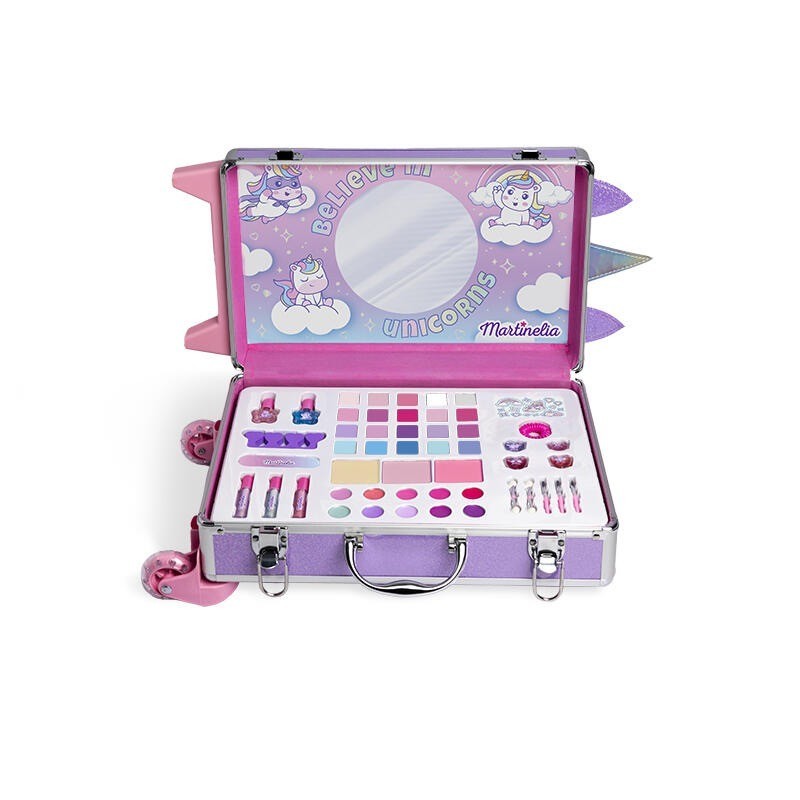 El maletín de maquillaje Little Unicorn con ruedas es un mundo de belleza en movimiento. Con 2 lacas de uñas, 13 lipgloss, cuatro anillos con bálsamo labial, 20 sombras de ojos, 3 coloretes, goma para el pelo, aplicadores, pinceles, lima de uñas y separadedos, tienes todo lo que necesitas para lucir radiante en cualquier lugar. ¡Lleva la magia contigo! 20 sombras de ojos, 10 brillos de labios, 4 anillos de brillo de labios, 3 coloretes, 3 cepillos, 2 esmaltes de uñas, 2 aplicadores, lima de uñas, separador de dedos, pegatinas, lazo para el cabello en espiral.