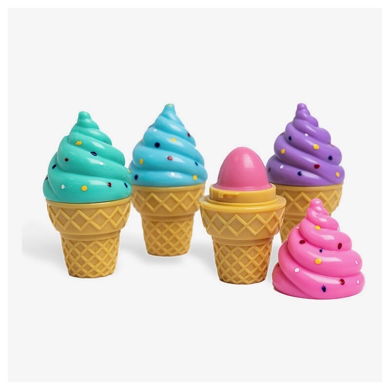 6gr Nuestros brillos más originales. Divertidos conos de helados relleno de bálsamo labial. Disfruta de su agradable aroma afrutado y dulce y colecciónalos todos. Con sabor a uva, fresa, sandía y nubes de azúcar.