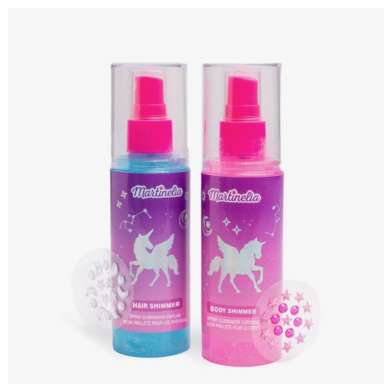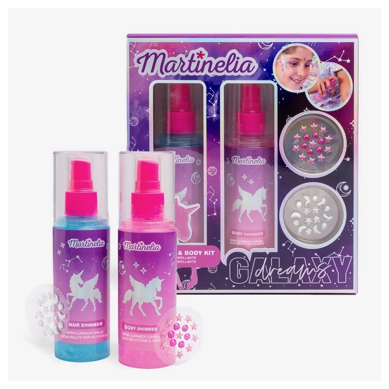 ¡Lleva tu look a otro universo con el MARTINELIA GALAXY DREAMS GLOWY HAIR & BODY KIT! Este kit todo en uno te permite crear un cabello de ensueño con tonos vibrantes y destellos cósmicos que capturan la magia del espacio. Diseñado para quienes quieren brillar con un estilo fuera de este mundo, este kit incluye colores intensos, fáciles de aplicar, que se combinan perfectamente para un efecto galáctico único. ¡Atrévete a explorar nuevas galaxias con estilo! Purpurina corporal de 100 ml Purpurina capilar de 100 ml Gemas faciales