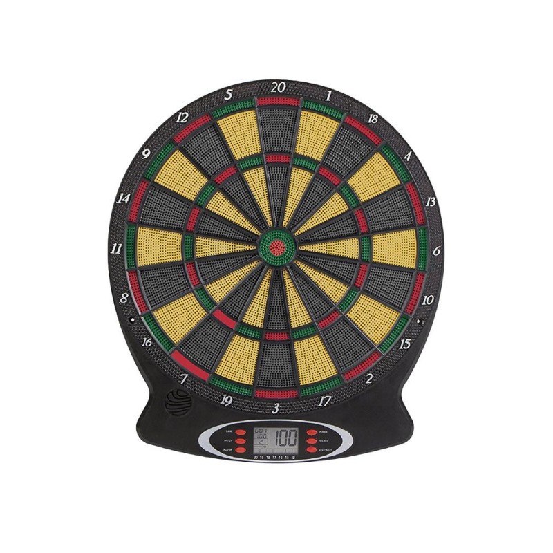Magnífica diana electrónica con pantalla LCD, con 18 juegos diferentes y hasta 159 variaciones. La diana tiene indicadores de sonido para avisar cuando se acertó en un segmento sencillo, doble, triple, cerrado, abierto e incluso si has dado al centro de la diana. Los dardos tienen punta de plástico. Pueden jugar hasta 8 personas a la vez. Incluye: 1 diana electrónica, 6 dardos completos, 6 puntas extra e instrucciones. Medidas aproximadas de la diana: 43 cm de largo, 38 cm de ancho y 2 cm de fondo. Medidas aproximadas de los dardos: 14 cm de largo y 4 cm de ancho.