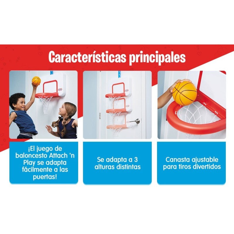Esta divertida canasta permite que los niños jueguen al baloncesto en el interior. Se adapta a tres alturas diferentes y se fija fácilmente a cualquier puerta. La pelota tiene el tamaño perfecto para los más pequeños. Cuando el juego no está en uso, se pliega para que puedas usar la puerta sin quitar el tablero. Peso (kg): 2,5; Altura (cm): 155; Ancho (cm): 42,6; Profundidad (cm): 23; Se requiere montaje; No se necesitan pilas. Edad recomendada: +2 años.