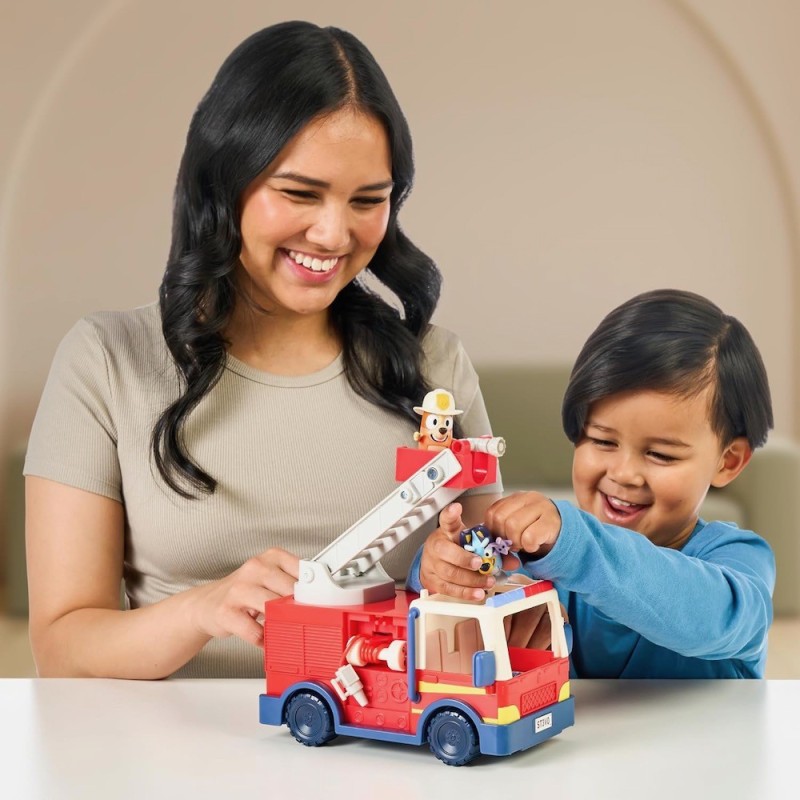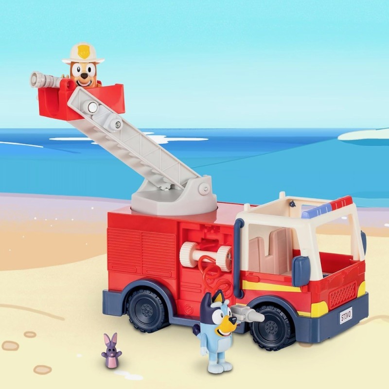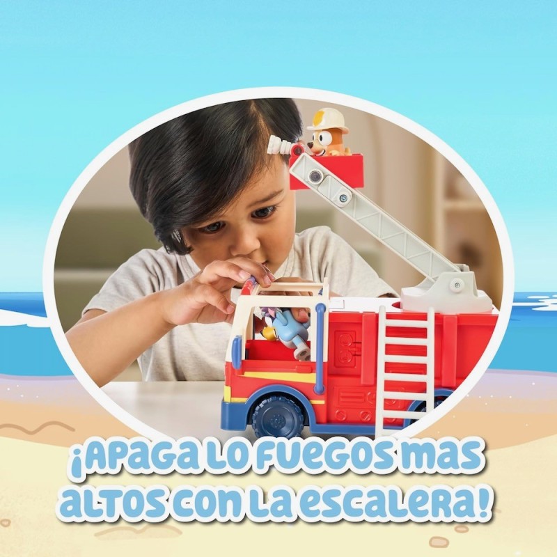 Edad recomendada: +3 años. ¡Nuevo vehículo de Bluey y su familia! El camión de bomberos, listo para rescatar. ¡Es hora de rescatar a quién se ponga en el camino con el camión de bomberos de Bluey! Incluye una figura de Bingo con sombrero de bombero, preparada para conducir y salvar a quien sea. Incluye 2 figuras, una marioneta y un set de pegatinas Es compatible con el resto de la colección por lo que todos podrán ayudar en el rescate. El regalo perfecto para los más pequeños.