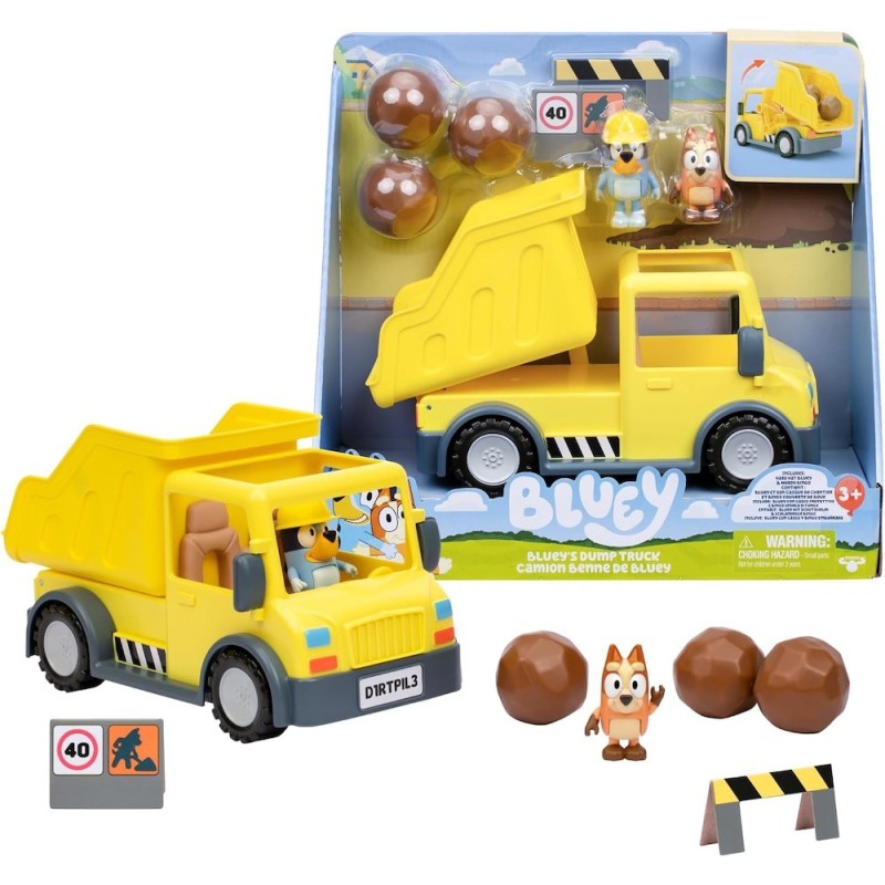 El Bluey's Dump Truck está diseñado para transportar diversión a lo grande. Su estructura robusta y detalles realistas permiten cargar, volcar y mover materiales de juego como las tres rocas de plástico incluidas, haciendo cada aventura aún más emocionante. Este set trae una figura de Bingo manchada de barro, lista para jugar al aire libre, y una figura de Bluey con casco de seguridad, preparada para dirigir las operaciones. Ambas figuras tienen acabados especiales y son articuladas para poses dinámicas.