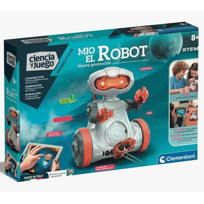 Un robot original y único para montar, con numerosas modalidades de juego gracias a dos sensores infrarrojos, el nuevo robot mio puede evitar obstáculos y seguir tu mano como un auténtico sabueso; puedes utilizar el micrófono para darle órdenes solo con dar palmadas y el panel con botones en la parte trasera del robot puede utilizarse para programar su ruta; la aplicación gratuita tiene dos funciones: codificación, para aprender los principios de programación basada en bloques, y tiempo real, para controlar movimientos, sonidos y efectos de luz, como si estuvieses usando un auténtico control remoto; por último, con el soporte marcador y el soporte de imán podrás, respectivamente, hacer que el robot dibuje o que busque pequeñas monedas y clips. Edad recomendada: +8 años.
