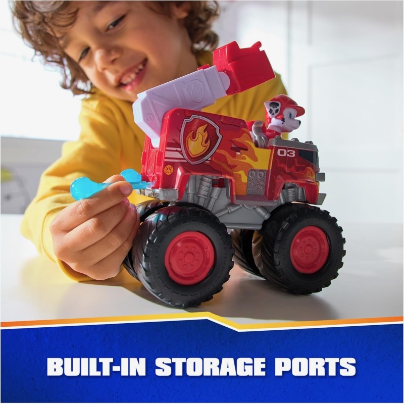 Camión de juguete con ruedas grandes: los camiones de juguete Rescue Wheels cuentan con un estilo genuino de Paw Patrol y neumáticos de camión de gran tamaño, por lo que puedes llevar tus emocionantes aventuras de juego de simulación fuera de la carretera, al igual que en el espectáculo. FIGURA DE ACCIÓN EXCLUSIVA: Marshall está preparado con su nuevo uniforme de Rescue Wheels, completo con casco y mochila Clip Marshall en el asiento del conductor antes de correr a una misión de rescate llena de acción Lanzador de proyectos: el camión monstruo con temática de Camión de bomberos de Marshall cuenta con 2 proyectiles, con puertos de almacenamiento especiales. Carga el proyectil en el lanzador, luego presiona el botón para disparar y salvar el día.