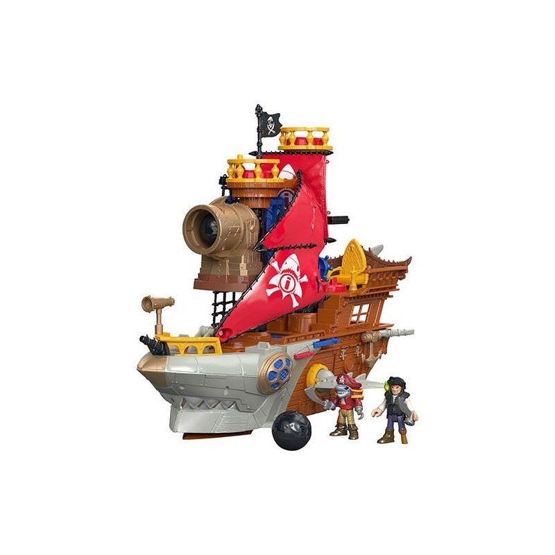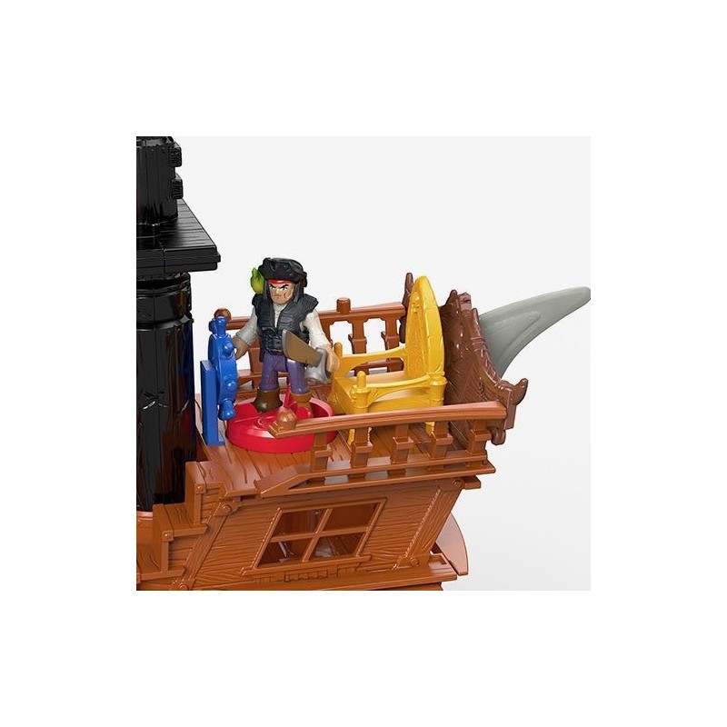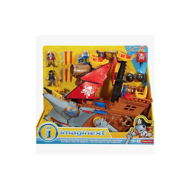 ¡Al abordaje! Es un barco pirata o un tiburón gigante? ¡Es un barco pirata-tiburón! Esos malvados piratas han camuflado su barco para que parezca un tiburón. Hazlo rodar para que mueva sus aletas, ¡como si estuviese nadando! Para proteger tu tesoro de Barbanegra y sus secuaces, ¡aprieta la plataforma de activación para capturar a los invasores de un gran bocado! Todavía quedan enemigos? Gira otra plataforma de activación para apuntar el cañón y disparar, o pulsa el botón del lanzador para disparar proyectiles. ¡Todo el mundo a sus puestos para vivir más aventuras de piratas! Los pequeños bucaneros podrán encerrar a los prisioneros en una celda que se abre y se cierra, hacerlos caminar sobre la tabla... o colgarlos del mástil. Quieres asegurarte de que el tesoro está a salvo? Gira una plataforma de activación para acceder al escondite secreto. (Uf, ¡sigue ahí!). Los aventureros más pequeños podrán disfrutar de todas las aventuras que puedan imaginar con este barco pirata. ¡Activa aventuras con Imaginext®! ¡Atención, tiburón! Haz rodar el barco para que se muevan las aletas. Tienes ganas de aventuras? Presiona la plataforma de activación para que el tiburón dé mordiscos y encierra a los prisioneros en el casco del barco. Levanta la trampilla para ver a los prisioneros capturados. Gira otra plataforma de activación a la izquierda para ver el escondite secreto del tesoro, ¡y gírala hacia la derecha para disparar los cañones! Incluye un Barco pirata-tiburón, dos figuras de piratas, dos cascos, dos espadas, una bola de cañón, cuatro proyectiles, un catalejo y un tesoro. Edad recomendada: +3 años.