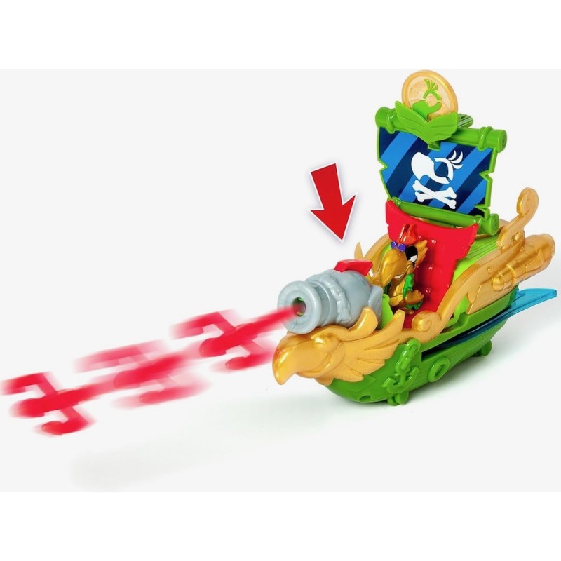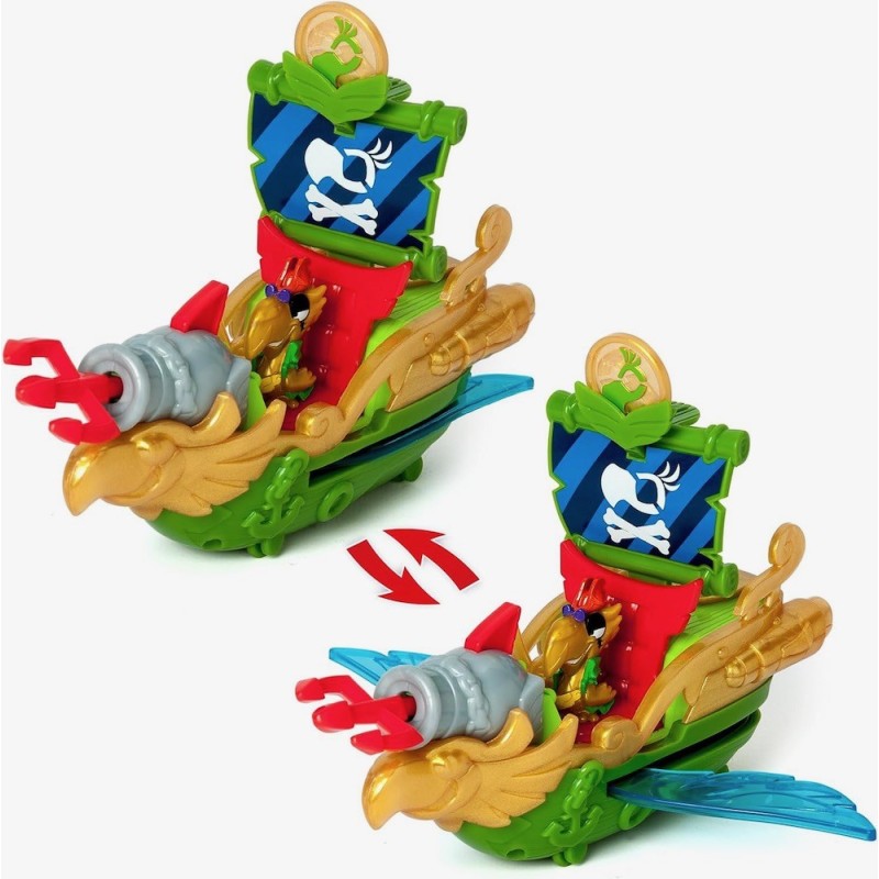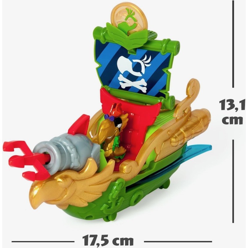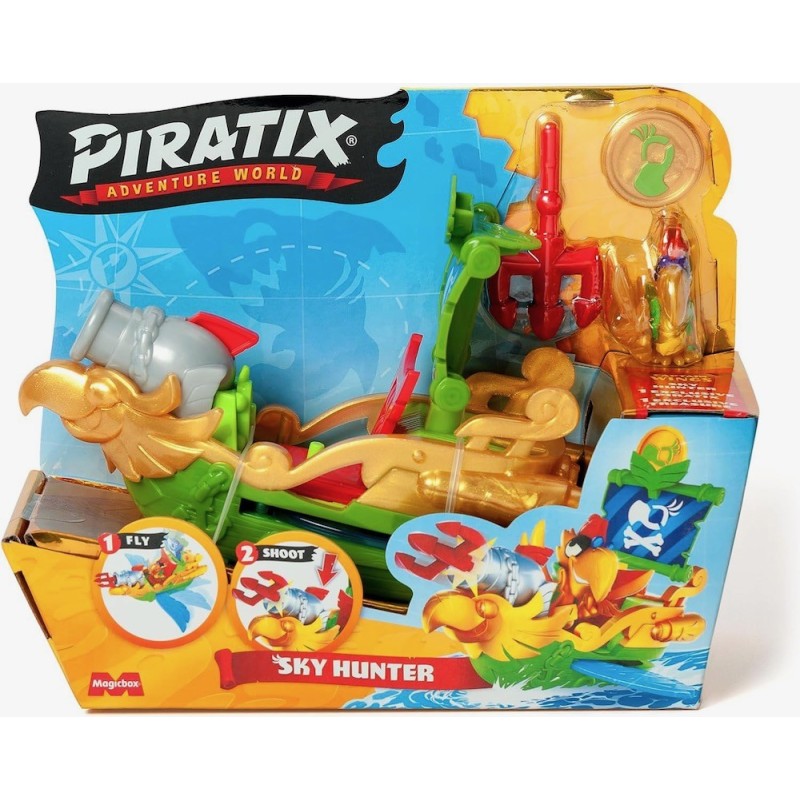 ¡Por las barbas de Neptuno! ¿Qué es este barco? ¡Es Sky Hunter y tiene el poder del loro! Surca los mares y usa el tesoro para activar sus poderes… ¡Al abordaje! ¡ACTIVA SUS PODERES! – El capitán Lobster encontró el Tesoro del Cangrejo en el arrecife más peligroso de Shark Island. El capitán Wings encontró el Tesoro de las Alas en el Pico del Águila, el más alto de Shark Island. Ésta le otorgó un poder a su embarcación: utiliza la moneda para activarlo ¡y sus alas batirán fuertemente para alcanzar una velocidad de doscientos nudos! También puedes disparar el cañón con su proyectil exclusivo y hundir cualquier embarcación. ¡Al abordaje! FIGURAS Y ACCESORIOS EXCLUSIVOS – Incluye 1 Piratix exclusivo: el capitán dorado Wings, junto son su tesoro exclusivo que activa poderes