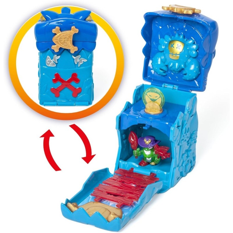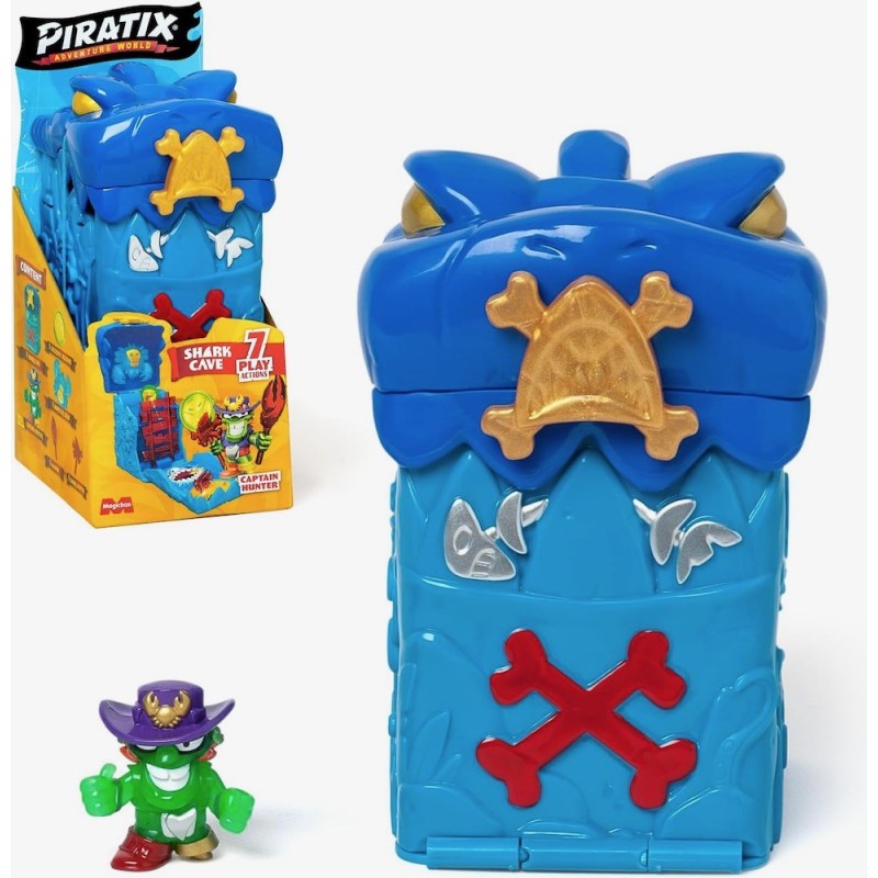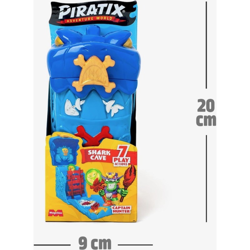 Edad recomendada: +3 años. Medidas: 13 x 8,78 x 9,9 cm. La localización de la Shark Cave es uno de los secretos mejor guardados de Shark Island, pero se cuenta entre susurros de miedo que solo hace visible cuando la marea baja en la zona norte de la isla, un área completamente infestada de tiburones; Solo ha habido un Piratix que haya conseguido entrar para hacerse con el tesoro: el Capitán Hunter Jack; Pero desde ese momento no se lo ha vuelto a ver…Podrás desafiar los misterios de la Shark Cave para conseguir su tesoro… y salir para contarlo ENCUENTRA LA COMBINACIÓN PARA ABRIR LA CUEVA – Una vez dentro encontrarás al Piratix encerrado en una mazmorra guardada por un cangrejo gigante al que tendrás que enfrentarte si quieres liberar a tu compañero; Cuando lo hayas vencido, encontrarás debajo suyo el tesoro exclusivo, ¡con efecto cristal y “glitter” CONSIGUE EL TESORO Y ACTIVA SUS PODERES – Úsalo para abrir la puerta de la prisión y sacar al pirata; Una vez fuera, podrá cruzar el puente para encontrar los dos accesorios: un cetro para llevar la moneda y un accesorio mágico con el que podrá controlar el monstruoso cangrejo; El poder Piratix está contigo FIGURAS Y ACCESORIOS S – Incluye 1 Piratix: el Capitán Hunter, junto son su tesoro que activa poderes