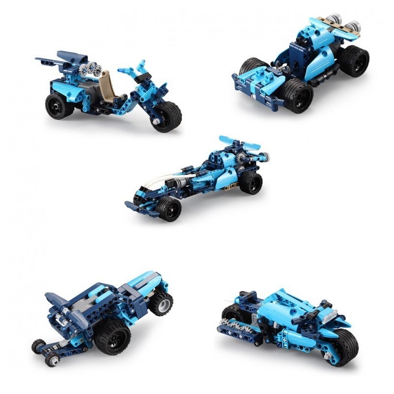 Edad recomendada: +8 años. Un auténtico laboratorio de mecánica donde puedes construir 6 modelos diferentes: El fantasma azul, 3 ruedas, Quad, coche de carreras, motocicleta y coche de acrobacias. 509 piezas y todas son Pull back.