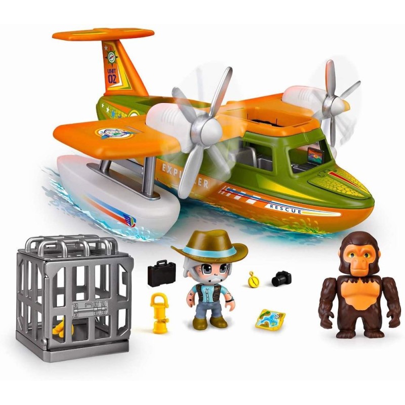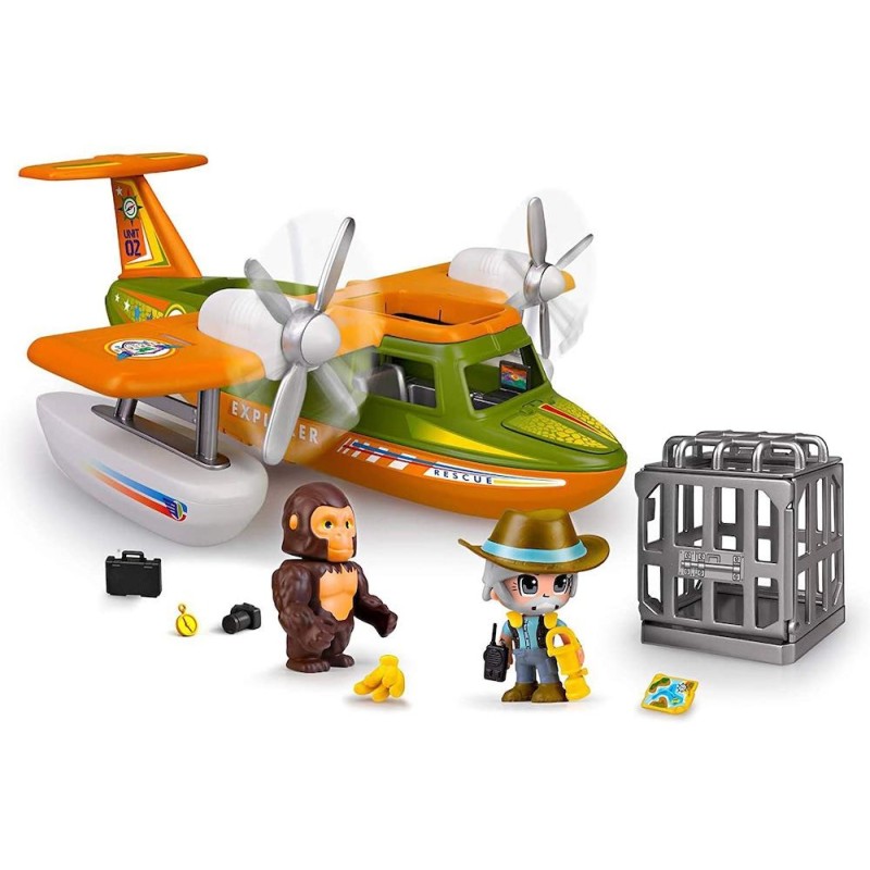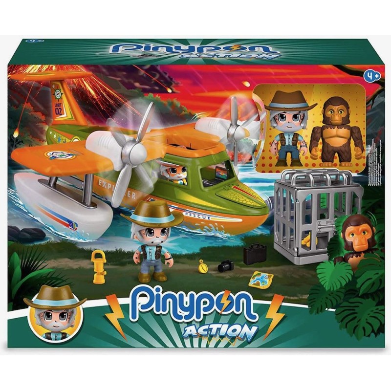 Hidroavión para rescatar animales salvajes en los lugares peligros y remotos. Flota en el agua pero tiene ruedas también para jugar en tierra. Lleva una gran jaula para transportar los animales en la bodega. Incluye 2 figuras de Pinypon Action, explorador y gorila. Con piezas intercambiables para hacer divertidas combinaciones. Con muchos pequeños accesorios de rescates y exploraciones. Edad recomendada: +4 años.