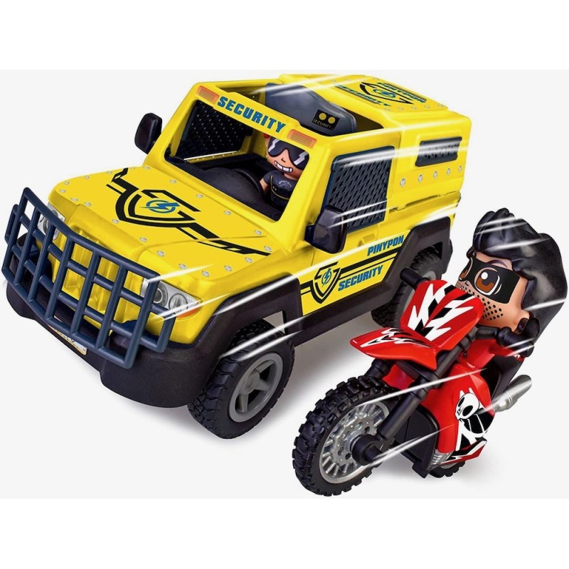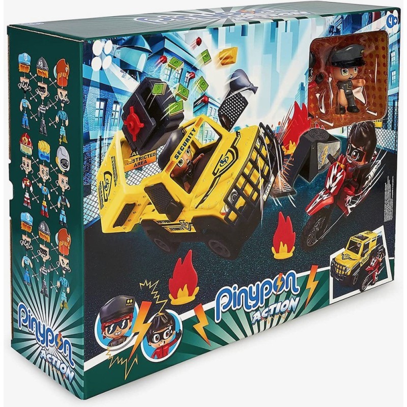 Gran set del robo adecuado de Pinypon Action, el asalto al furgón blindado, lleno de dinero. El ladrón paraliza el furgón blindado colocando una trampa en la calle. El ladrón consigue abrir la caja fuerte y se da a la fuga en su moto llevándose los lingotes de oro y fajos de dinero. Con un montón de accesorios de acción: dinamita; llamas; armas; caja fuerte, dinero y lingotes de oro. Incluye el furgón, la moto y 2 figuras: conductor del furgón blindado y el ladrón.