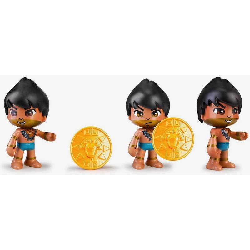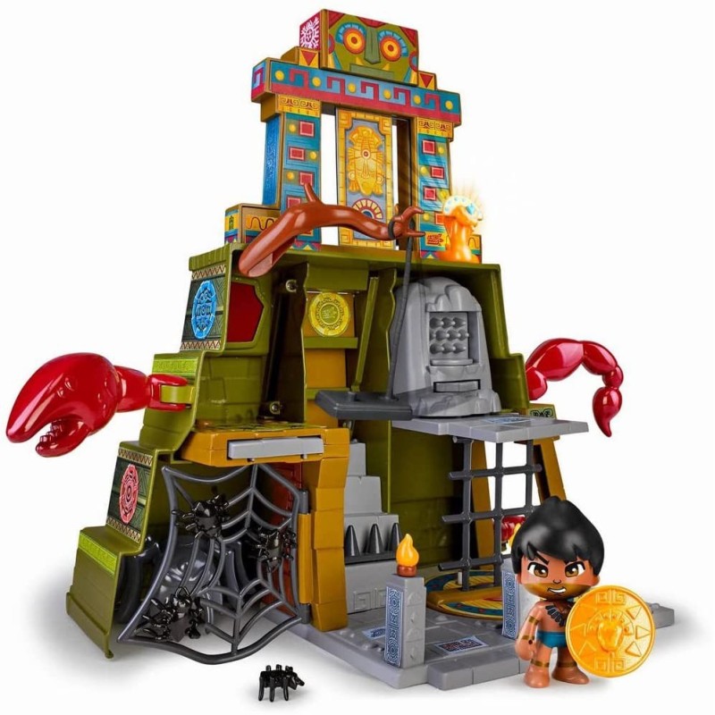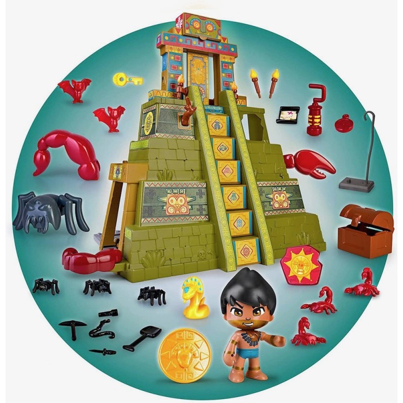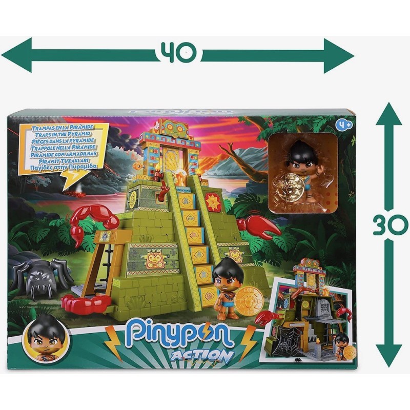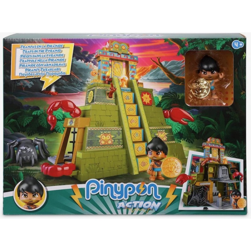 La pirámide maya de Pinypon Action guarda un valioso tesoro, una serpiente dorada de valor incalculable, protegida por muchas trampas y obstáculos, y si no consigues llegar al tesoro te puedes quedar atrapado dentro para siempre. Es imposible entrar por delante ya que las escaleras desaparecen. La entrada trasera está vigilada por unas gigantes colas de escorpión con su picadura mortal, hay que pasar las rejas giratorias, pasar por una tela araña terrorífica, pasar escorpiones bebés y al final encontrar la llave secreta que está escondida. Solo así consigues encontrar el tesoro. Incluye la figura de un explorador maya y una enorme araña, con partes intercambiables entre sí. Edad recomendada: +4 años.