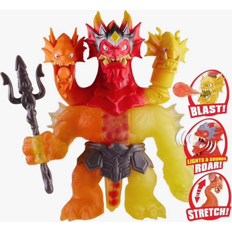 Heroes of Goo Jit Zu, los superhéroes estirables que protegen el mundo de los malvados salvajes. Llego la súper figura King Hydra del héroe definitivo, 3 rellenos diferentes y 3 cabezas con ataques diferentes. Descubre el interior que esconde con increíbles y sorprendentes rellenos, 3 en 1. Aprieta, estira y estruja al personaje y volverá siempre a su forma original; puede estirarse hasta 3 veces su tamaño. Con una cabeza que lanza misiles; otra cabeza con ataque mordisco y la tercera cabeza que se estira.