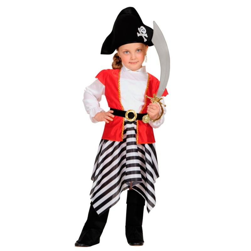 Disfraz pirata infantil Contiene: camisa con casaca, cinturón, gorro, falda y cubre botas Disponibel en dos tallas: 1-2 años, para niños de hasta 98cm 2-3 años, para niños de hasta 104cm