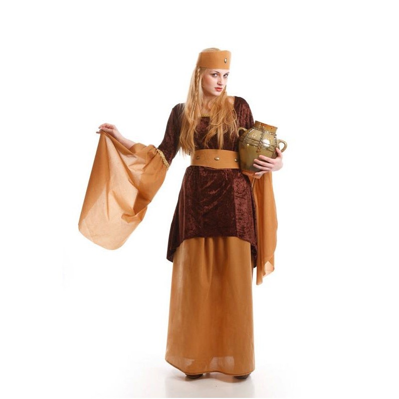 Disfraz medival de mujer, marrón. Talla M. Incluye casaca, falda, cinturón y tocado.