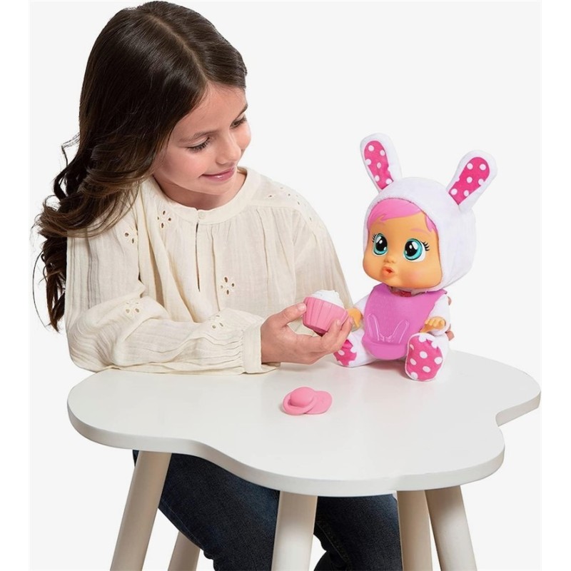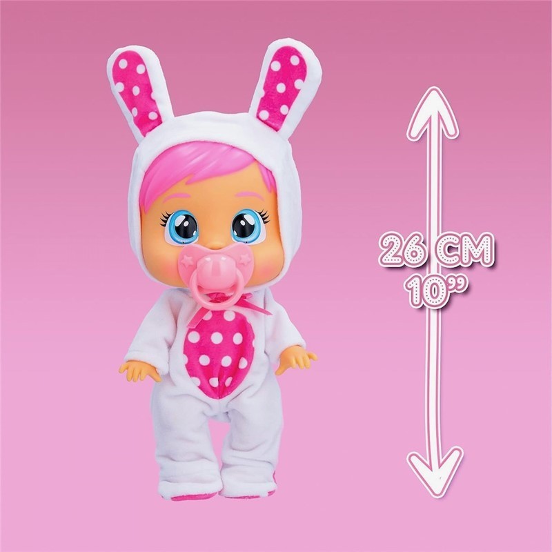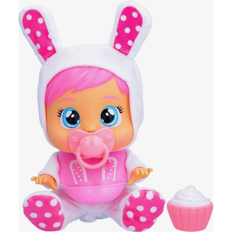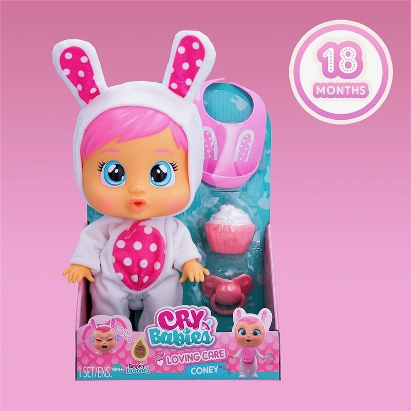 Conoce la nueva Coney de los Bebés Llorones, ahora en un tamaño reducido! Con este nuevo tamaño...es más ligera! También tiene el pelo y los ojos pintados! Coney viste su tradicional pijama personalizado y viene con un chupete y dos accesorios personalizados: un babero y un muffin. Como todos los Bebés Llorones, lloran lágrimas de verdad! Apriétale la cabeza y llorará lágrimas de verdad.