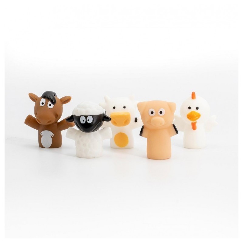 Set de 5 marionetas de goma con la temática de granja. Incluye una oveja, un caballo, un cerdito, una vaca y una gallina. Las marionetas desarrollan la imaginación, estimulan la capacidad de concentración y son divertidas. Este set es ideal para el baño por su material, pero también puedes inventar tus propias historias en cualquier otro lugar.