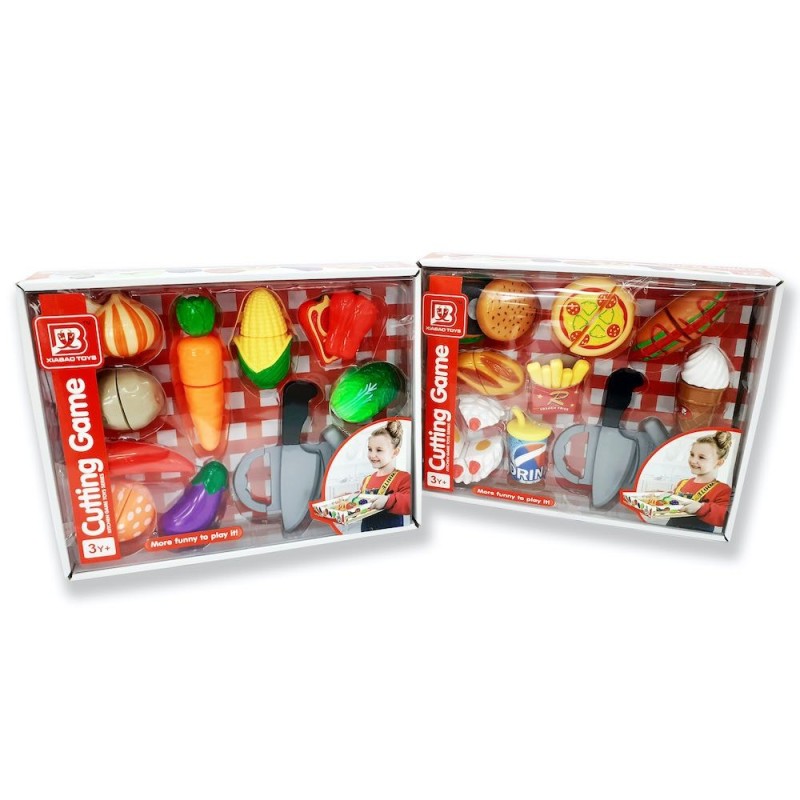 Caja de fruta o comida rápida, de plástico, con velcro y cuchillo y tabla de cortar. Para que los niños/as puedan jugar a partir y volver a unir las piezas. 2 modelos: frutas y comida rápida. Edad recomendada: +3 años.
