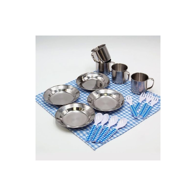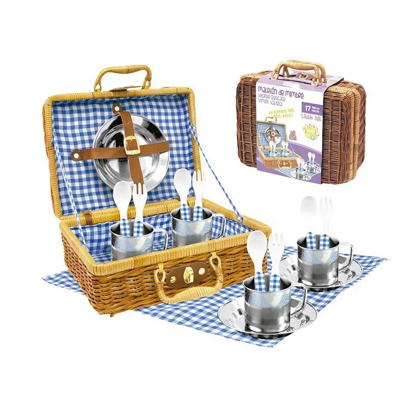 Edad recomendada: +3 años. Precioso maletín mimbre lleno con todos los accesorios necesarios para que puedas ir de picnic con tus amigas. Incluye 4 set completos con cubiertos , tazas , platos y mantel. Está decorado con un precioso cuadrito vichy azul.