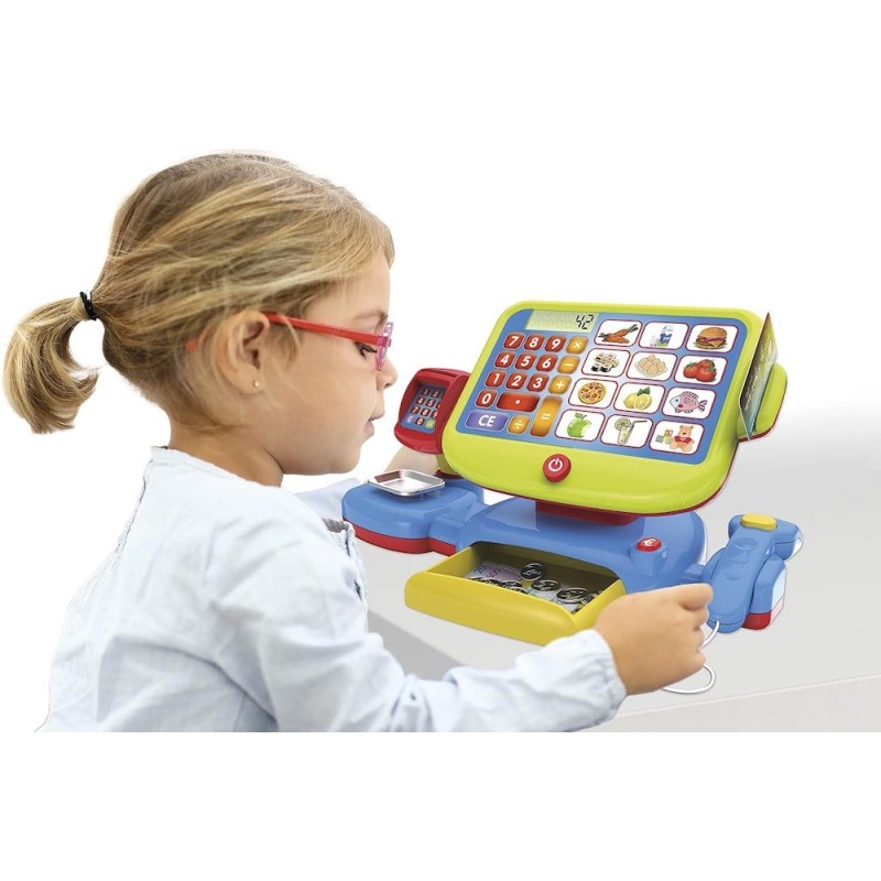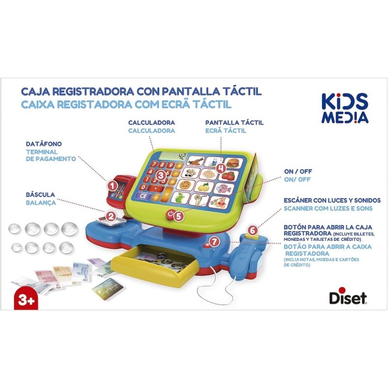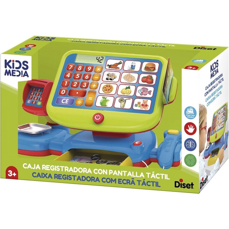Edad recomendada: +3 años. Caja registradora con pantalla para aprender y divertirse que fomenta la imaginación y el juego simbólico. La pantalla es LCD y táctil, en ella se muestra el precio con función de calculadora incluida. El escáner incluye luces y sonidos y el datáfono de la tarjeta de crédito también hace sonido. Dispone de una báscula para pesar los artículos comprados, monedas, billetes y una tarjeta de crédito para poder hacer el intercambio. El producto funciona con 3 pilas 3 AA que no vienen incluidas.