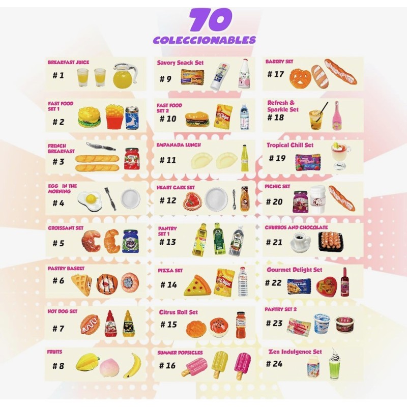Edad recomendada: +6 años. Cápsulas sorpresa: Descubre dulces, bebidas y mini comiditas únicas en cada cápsula. 70 coleccionables diferentes: Una amplia variedad para completar tu colección. Incluye libreta collector y pegatinas: Personaliza y organiza tus coleccionables. Colecciona todos para decorar el playset de la cocina: Amplía tu universo Mini World.