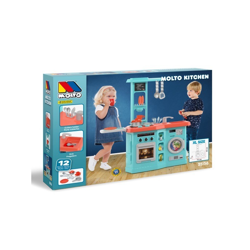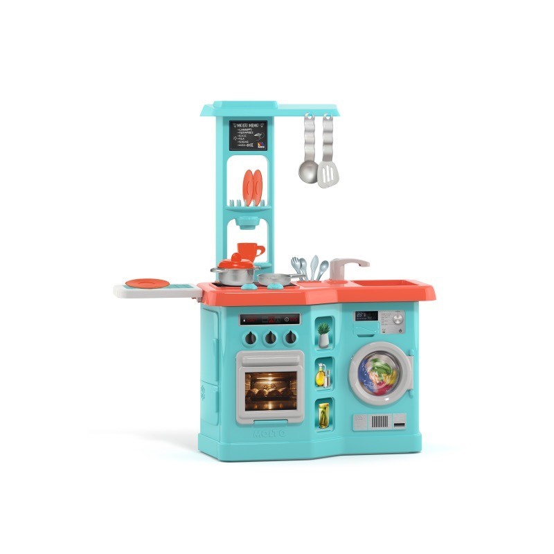 Medidas: 82 x 56 x 28 cm Completa cocina que incluye horno, campana, lavadora, mesa y un set de 12 accesorios. ¡Perfecta para que los peques preparen sus comidas! Fomenta la imaginación, habilidades sociales y lenguaje mientras juegan a ser chefs.