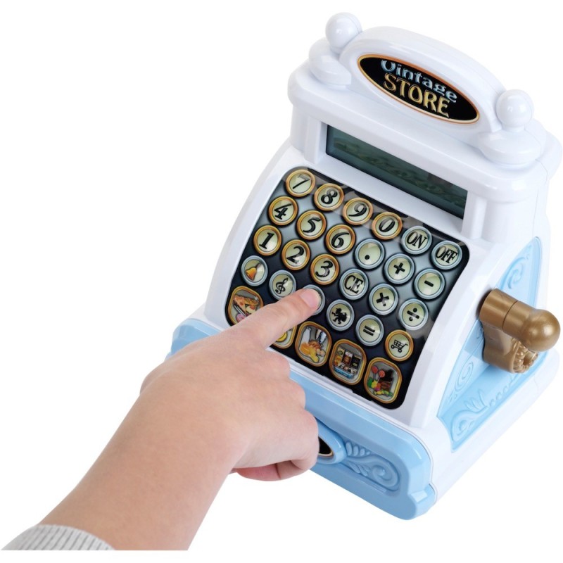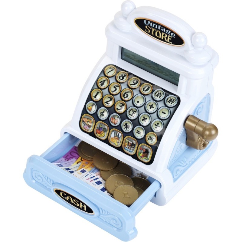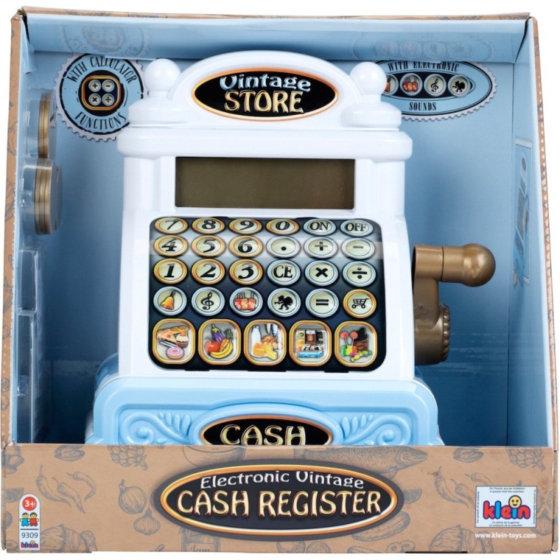 Edad recomendada: +3 años. La caja registradora electrónica vintage de Theo Klein está equipada con numerosas funciones, como varios sonidos, pantalla, función de computadora, compartimento de caja registradora extensible, manivela giratoria y dinero ficticio.