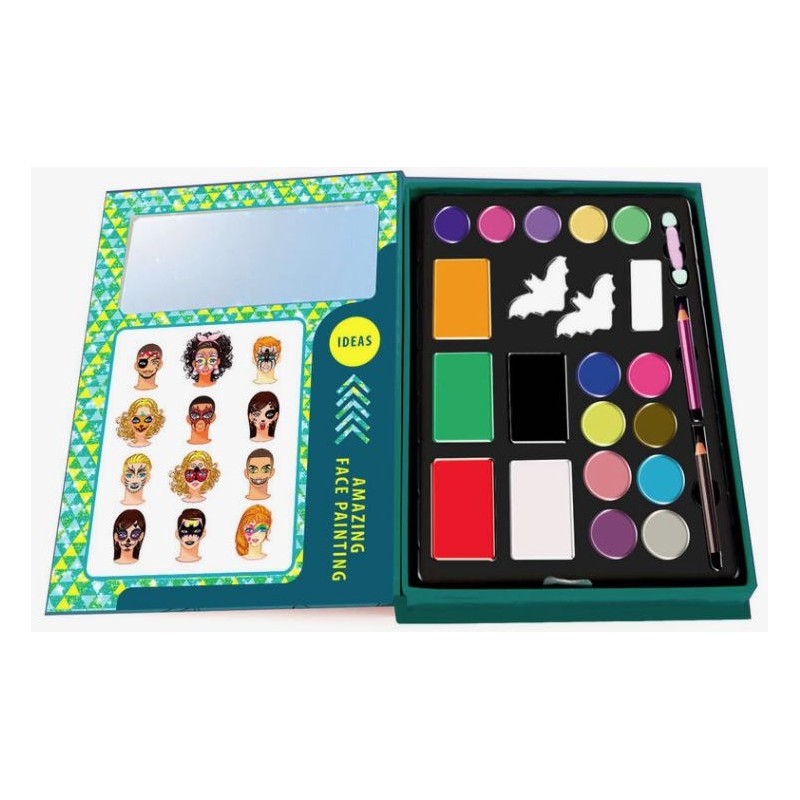 Un fantástico kit de maquillaje para niños con todo lo necesario para crear un disfraz aterrador ideal para la noche de Halloween, el kit de maquillaje contiene pinturas para la cara, sombras de ojos, lápices, aplicador y esponjas con forma de murciélago. Edad recomendada: +6 años.