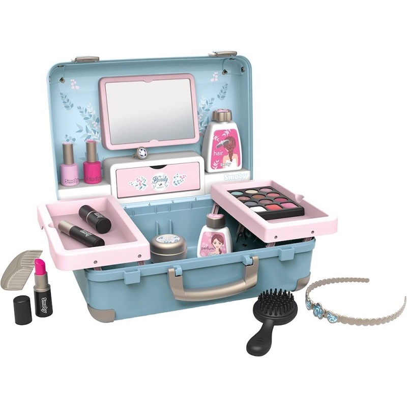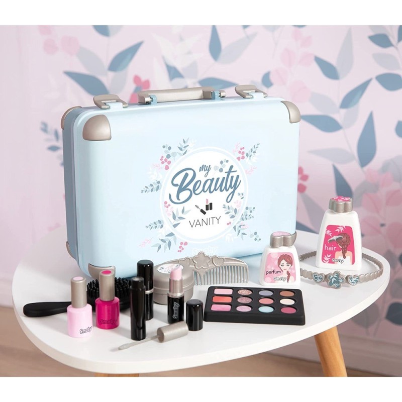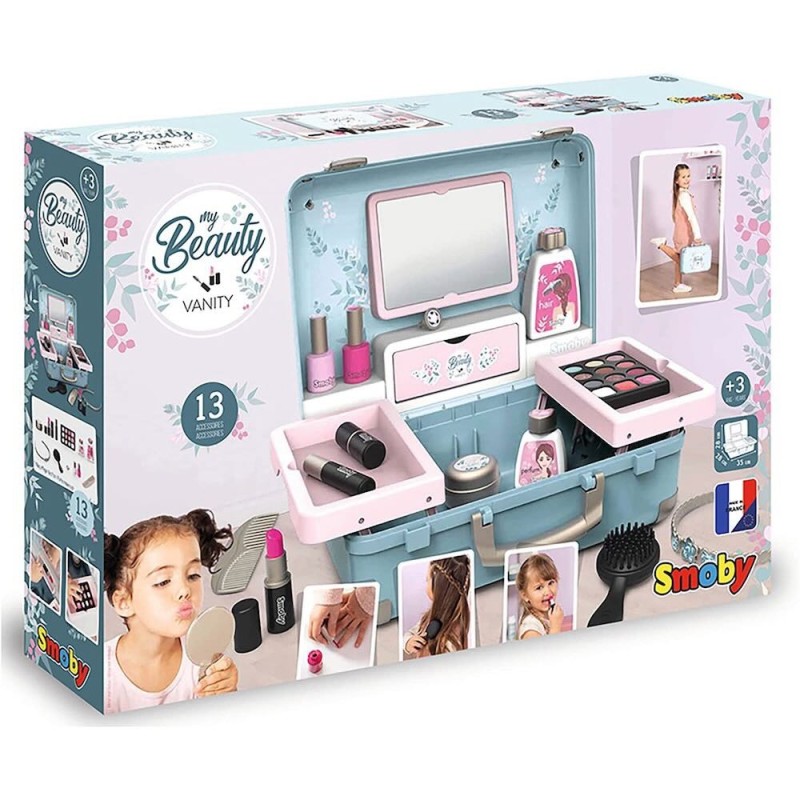 El maletín de cosméticos My Beauty está lleno de todo lo que se necesita para un maravilloso tratamiento de bienestar: ya sea el peinado, el estudio de uñas o el maquillaje, ningún deseo queda sin cumplir. Los 13 accesorios (cosméticos de juego falsos) encuentran espacio dentro del maletín con asa de transporte y así pueden llevarse a cualquier parte. Gracias a los dos cierres de seguridad, nada se perderá en el camino. El maletín también tiene un espejo y un compartimento secreto, y los estantes del interior se pueden bajar para dejar espacio a más cosméticos. Detalles del producto: Dimensiones (largo x ancho x alto): 35,5 x 28,6 x 28,5 cm. Contenido: 2 esmaltes de uñas, 2 barras de labios, 1 sombra de ojos, 1 paleta, 1 máscara de pestañas, 1 cepillo, 1 peine, 1 cinta para el pelo, 1 anillo y diferentes frascos Fabricado en Francia Material: plástico Edad recomendada: +3 años.