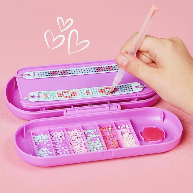 ¡Diseña tus propias pulseras! Hacer las pulseras es super sencillo: coge cera con el boli, coge una gema y pégala. Usa la caja para colocar todo el material y empezar a crear pulseras. Hay 30 plantillas diferentes de tres temáticas, ¿cuáles te tocarán? Cada pack incluye 5 pulseras, 6 bolsas de gemas diferentes, el boli, la cera y todo lo que necesitas para cerrarlas (abalorios, topes, hilo y una herramienta para ayudarte a cerrarlas). Edad recomendada: +7 años.
