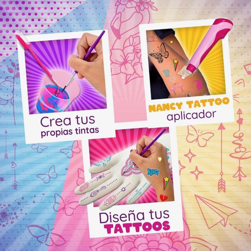 Edad recomendada: +8 años. Sumérgete en el innovador concepto de Smart Beauty Play, donde la creatividad y la belleza se fusionan para ofrecerte una experiencia única. Con este Tattoo Studio, podrás explorar un mundo de posibilidades para diseñar y crear tus propios tatuajes temporales. El Tattoo Studio te permite explorar el fascinante mundo de los tatuajes, ofreciéndote la oportunidad de experimentar con diferentes diseños y técnicas. Desde la creación de tus propias tintas temporales hasta la aplicación de tatuajes adhesivos, expresa tu estilo de manera diferente. El kit viene con un aplicador de tatuajes exclusivo con el diseño de Nancy, que te ayudará a aplicar los tatuajes de manera precisa y sencilla. Este aplicador añade un toque especial y divertido a la experiencia, haciéndola aún más emocionante. Con más de 120 diseños diferentes, incluyendo opciones multicolor, que brillan en la oscuridad (GID) y en negro, tendrás una amplia variedad para elegir. El kit viene con un libro educativo que incluye diferentes actividades para que puedas seguir explorando y aprendiendo mientras te diviertes.