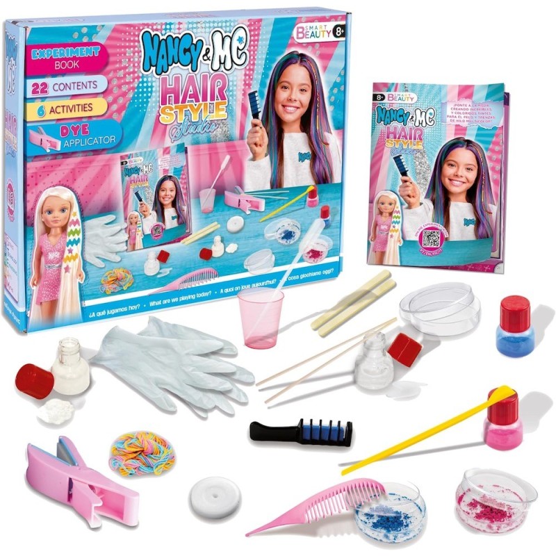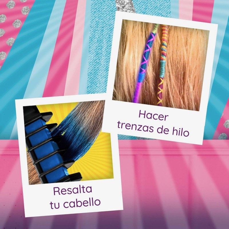 Edad recomendada: +8 años. El Hairstyle Studio es parte del nuevo concepto de Smart Beauty Play, donde la creatividad y la belleza se fusionan para ofrecerte una experiencia única. Este kit está diseñado para que puedas expresar tu estilo personal a través de tu cabello, permitiéndote crear looks espectaculares y peinados. El kit incluye tintes temporales de diferentes colores que podrás aplicar directamente en tu cabello o mezclar para crear tonos personalizados. También cuenta con un peine especial para aplicarte mechas en el cabello de dos colores diferentes: azul y rosa. Además de los tintes y el peine para mechas, el kit también incluye hilos de diferentes colores para que puedas crear trenzas únicas y llamativas. Estos hilos añaden un toque de color y originalidad a tus peinados, permitiéndote experimentar con diferentes estilos y diseños. Con el Hairstyle Studio, no solo podrás aplicar tintes temporales en tu cabello, sino que también podrás crear tus propios tonos personalizados. Esto te brinda la libertad de experimentar con diferentes combinaciones de colores y crear looks totalmente diferentes y originales.