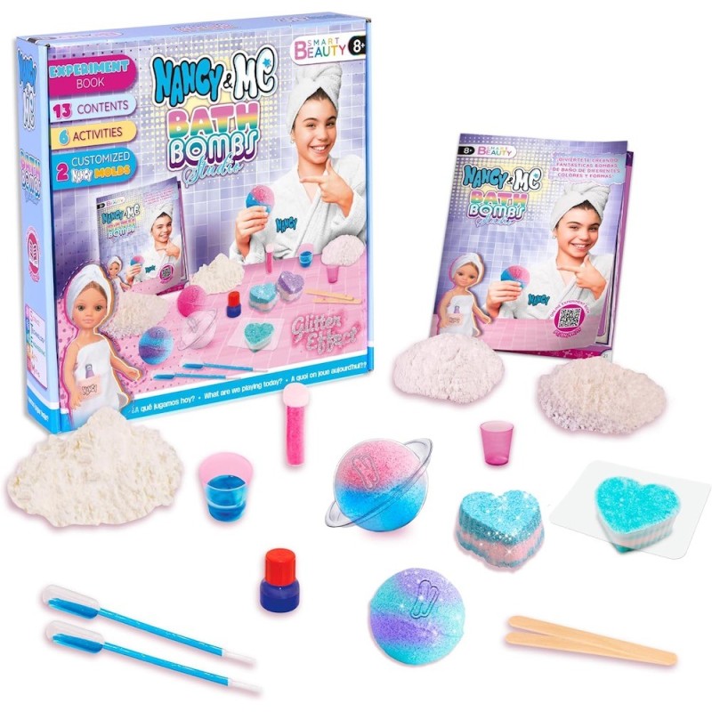 Edad recomendada: +8 años. El Bath Bombs Studio es parte del innovador concepto de Smart Beauty Play, donde la creatividad y la belleza se combinan para ofrecer una experiencia única. Este kit te permite sumergirte en el mundo de la creación de bombas de baño personalizadas ofreciéndote el disfrute de un spa en casa. Podrás crear tus propias bombas de baño personalizadas en una variedad de colores y formas. Desde redondas hasta en forma de estrella, las posibilidades son infinitas. Este kit te ofrece todos los ingredientes necesarios para hacer las bombas de baño desde cero. El kit incluye dos moldes exclusivos con diseños únicos de Nancy, que añadirán un toque de estilo a tus creaciones. Estos moldes te permiten dar forma a tus bombas de baño de manera fácil y divertida, añadiendo un toque de elegancia y sofisticación a tu experiencia de baño. Además de los ingredientes para hacer las bombas de baño, el kit también incluye purpurina para que puedas customizar tus creaciones y añadir un toque de brillo y magia a tu experiencia de baño. La purpurina te permite dar un toque único y especial a tus bombas de baño.
